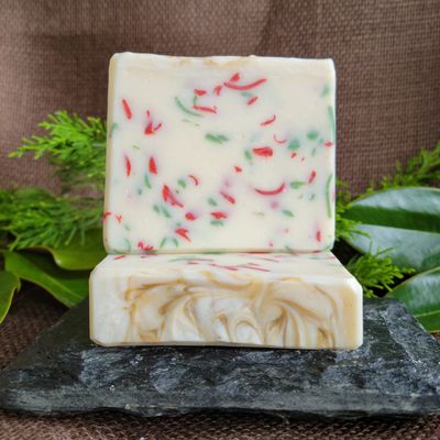 Christmas Confetti fragrance has top notes of greens and pineapple, with mid notes of pine and spice, and woody bottom notes. The winter wonderland fragrance will remind you of a snow-covered cabin in the woods.